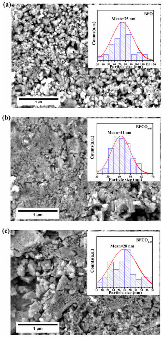 FESEM micrographs of (a) BFO, (b) BFCO0.07, and (c) BFCO0.15 nanopowders with the corresponding average grain size distribution shown in the inset.