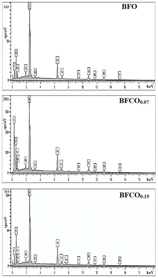 Energy-dispersive X-ray spectroscopy (EDX), depicted in Figure 7, confirmed the elemental composition and phase purity of the nanoparticles. The spectra show Bi, Fe, Co, and O across all samples, with characteristic peaks at O (Kα, 0.52 keV), Fe (Lα, Kα, Kβ at 0.70, 6.40, and 7.05 keV), Bi (Mα, Lα, Lβ at 2.49, 10.38, and 13.02 keV), and Co (Kα, Lα at 6.93 and 0.77 keV). No extraneous peaks were detected, confirming phase purity.