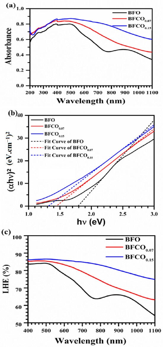 (a) Absorbance spectra of composition. (b) Tauc’s plots to extract the optical bandgap. (c) Light-harvesting efficiency of BFO, BFCO0.07, and BFCO0.15 nanopowders.