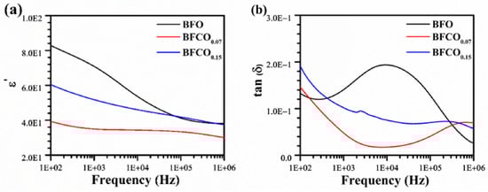 It can be seen that, for all samples, the overall dielectric permittivity decreases with increasing frequency, a typical behaviour of ferroelectric materials consistent with Maxwell–Wagner–Sillars (MWS) polarization [,].