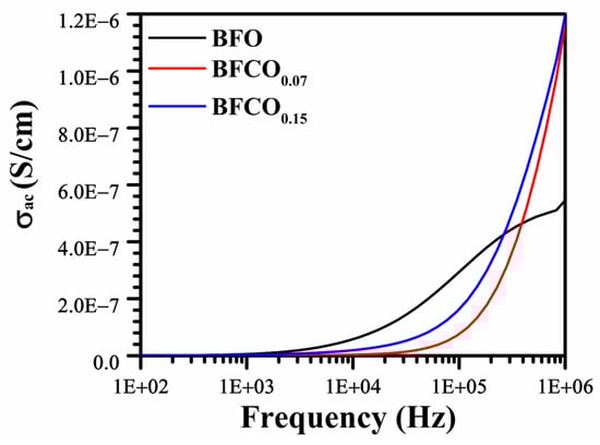 AC conductivity vs. frequency curves for pure BFO, BFCO0.07, and BFCO0.15 at room temperature.