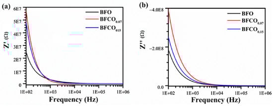 An analysis of Figure 11a,b illustrates the evolution of impedance as a function of frequency for the BFO, BFCO0.07, and BFCO0.15 samples. The impedance analysis reveals a progressive decrease in the real impedance (Z′) with increasing frequency for all compositions. Additionally, the curves for BFCO0.07 and BFCO0.15 exhibit a higher low-frequency Z′ for BFCO0.07 due to [Co2+-VO••] trapping, while BFCO0.15′s lower Z′ reflects Co3+-mediated VO•• reduction [].