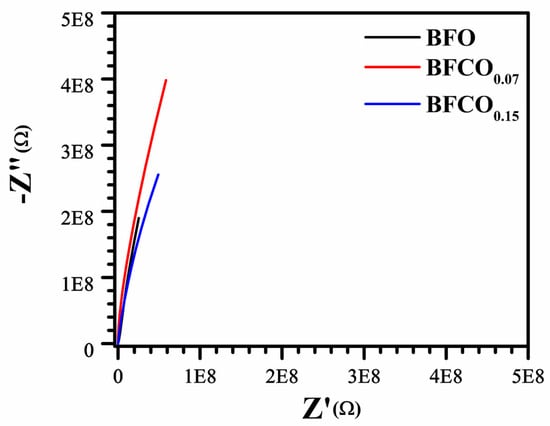 Nyquist plots of real (Z’) versus imaginary (Z’’) impedance of BFO, BFCO0.07, and BFCO0.15.