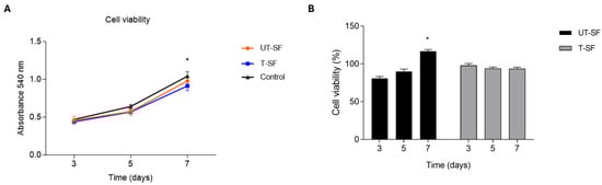 The MTT assay was carried out to analyze the effect of UT-SF and T-SF scaffolds on 3T3 cell viability. The results show an increase of 540 nm absorbance, corresponding to an increase in cell number and of 3T3 grown on UT-SF and T-SF scaffolds, as well as on the control, up to day 7 [].