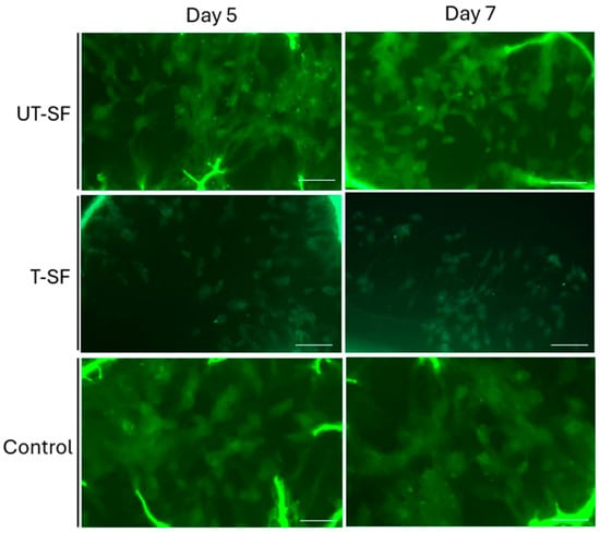 Cell viability analysis of 3T3 fibroblasts using Live/Dead assay. Images show live cells grown in contact with UT-SF and T-SF scaffolds and on the control at 5 and 7 days. Dead cells at each time point were not detected. Scale bar: 50 μm.