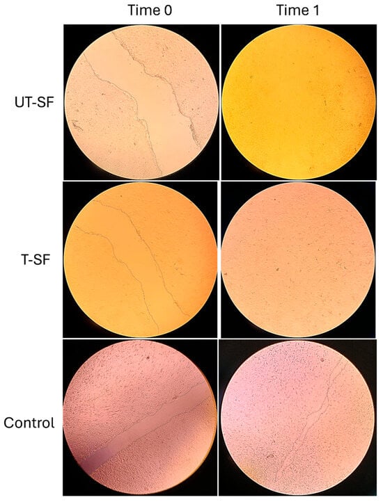 The wound healing properties of UT-SF and T-SF silk fibroin scaffolds were assessed on 3T3 fibroblasts grown in contact with samples and with the control. Specifically, wound healing was investigated in vitro using a scratch assay, conducted at the initial time point (Time 0) and after 24 h of incubation (Time 1). Microscopy images show the scratched fibroblast monolayer of UT-SF, T-SF, and control samples at Time 0 and Time 1 (Figure 4), illustrating the wound closure of the three experimental groups. At Time 1, the wound closure rate is completed (100%) in UT-SF and T-SF, whereas in the control sample, the wound closure rate is 78.5% (Figure 5). In addition, digital images show a stronger repopulation of fibroblasts in the T-SF compared to the UT-SF samples (Figure 5). The results reveal that the presence of silk fibroin enhanced the wound closure and that the presence of silver further improved the wound healing capacity of the scaffold. These findings demonstrate the regenerative properties of silk fibroin scaffolds and their synergistic activity with silver.