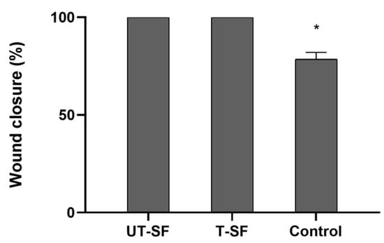 Quantification of wound gap distance (%) using ImageJ software at Time 1. Graph reports mean of measurements of the two independent experiments. At Time 0, the mean of the wound closure rate is 0% in all experimental groups (not showed in the graph). At Time 1, the mean of the wound closure rate is 100% in 3T3 grown in contact with UT-SF and T-SF scaffolds, whereas it is 78.5% in the control group (p < 0.05). (* p < 0.05).