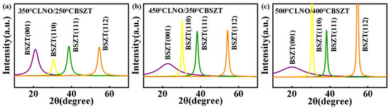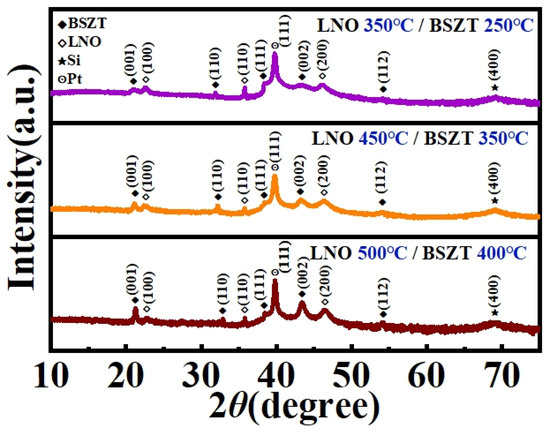 In order to find the optimal deposition temperatures for our “hot template, cold film” design, three sets of variable-temperature experiments were carried out, i.e., LNO 350 °C/BSZT 250 °C, LNO 450 °C/BSZT 350 °C, and LNO 500 °C/BSZT 400 °C. The results of these three sets of experiments were compared as follows. Firstly, we performed XRD 2