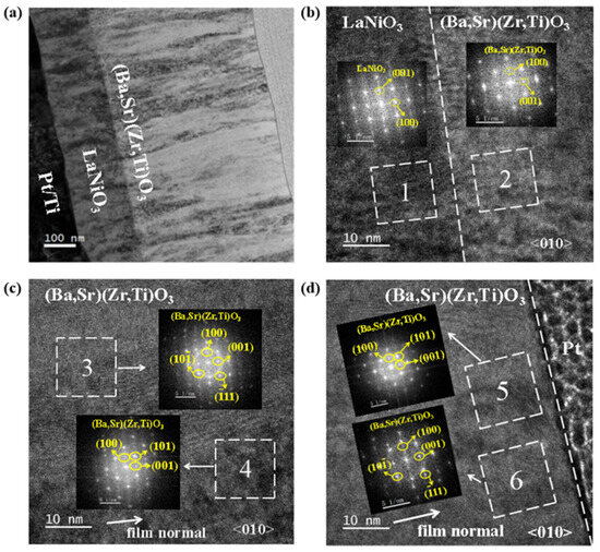 Figure 7c,d in selected areas 3, 5, 4, and 6, the {110} and {111}-oriented BSZT grains were the dominant grain population in the BSZT film away from its interface with LaNiO