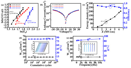Figure 1b,d display the mono-polar P-E loops of the two films, which simulate the charge–discharge process of the film capacitors. The energy storage parameters were obtained from these mono-polar loops, including the recoverable energy density and charge–discharge/energy efficiency