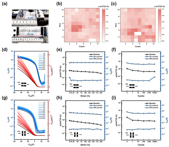 Mechanical–electrical properties of fully stretchable OFETs. (a) Physical images at 0% and 200% strain. (b) Mobility distribution in fully stretchable D3 OFET arrays. (c) Mobility distribution in fully stretchable D4 OFET arrays. (d) Transfer curves of the D4 device under different strains (TD⟂CTD). (e) Changes in on/off current and mobility of the D4 device under different strains (TD⟂CTD). (f) Changes in on/off current and mobility of the D4 device after multiple stretch–release cycles (up to 10000 cycles) at 100% strain (TD⟂CTD). (g) Transfer curves of the D4 device under different strains (TD‖CTD). (h) Changes in on/off current and mobility of the D4 device under different strains (TD‖CTD). (i) Changes in on/off current and mobility of the D4 device after multiple stretch–release cycles (up to 10000 cycles) at 100% strain (TD‖CTD).