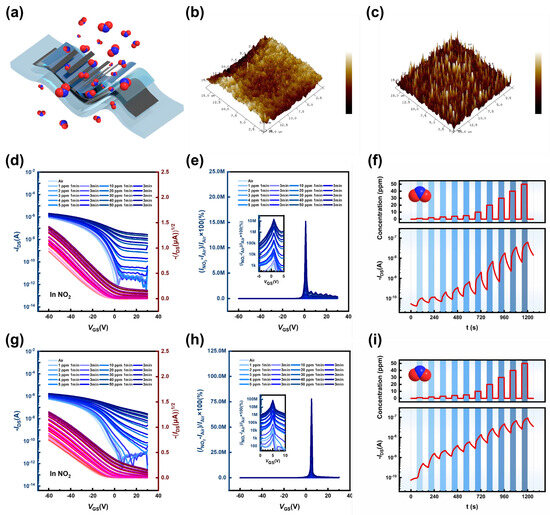 The test methods and parameter configurations for the performance test were as follows: (1) In the transfer characteristic test, the source–drain voltage VDS was set to −60 V (for the rigid device) or −40 V (for the flexible device), the gate voltage VG was set to 30~60 V, and the clamp current was set to 10 mV. (2) For gas testing, the pulse width was limited at NO2 (an exposure time of 1 min or 3 min and a total flow rate of 1000 mL/min). (3) In the steady-state gas sensitivity characterization, a D4’ sensor was used as a model device, and transfer curves were recorded at different gas concentrations (0 ppm, 1 ppm, 2 ppm, 3 ppm, 4 ppm, 5 ppm, 10 ppm, 20 ppm, 30 ppm, 40 ppm, and 50 ppm). (i) The variation in gas responsivity with gate pressure modulation under different NO2 gas concentration conditions was calculated and plotted using the equation R = (IDS − I0) × 100%. (ii) The average sensitivity was determined based on the slope of the linear plot of the response at different concentrations. (4) In the transient gas-sensitive characterization study using the D4’ sensor as the model device, the I-t curve of the real-time response to a 10 ppm gas concentration was measured with a constant current and voltage output after the device was turned on. In order to test the reliability of the variation in the current response, the real-time gas response I-t curve of D4’ was recorded for 100 cycles by repeatedly applying the gate voltage of the stepped output. The stepped output gate voltage VG comprised the turn-on voltage Von and the maximum gate voltage, respectively, in 100 consecutive cycle tests. (5) During the investigation of the enhancement mechanism of the gas-sensitive performance of the NO2 sensor, the tests included the following: (i) transfer curves under different NO2 gas concentration conditions; (ii) change curves of gas responsiveness with the regulation of gate pressure; (iii) the variation in gas responsivity with the NO2 gas concentration under the condition of VG = Von; and (iv) transient studies, i.e., real-time source–drain current variation with the gas concentration. (6) In the reproducibility test, the experiment was conducted with 10 ppm of NO2 used as the analyzed gas, with a fixed exposure time of about 3 s, and the data showed a change in IDS for about 6 s, with a cycle period of 220 s. According to the saturation region and subthreshold region of the D3 and D4 devices, the settings of VDS = −40 V and VG = −15 V were used for the single-solvent system D3, and VG = −4 V was used for the mixed-solvent system D4; then, the changes in the channel current IDS were measured.