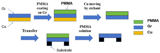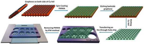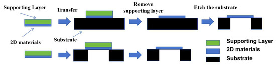 In wet transfer processes using polymer support layers, PMMA is commonly employed as a temporary carrier for 2D material transfer. The standard procedure involves chemically etching away the copper substrate to adhere the PMMA-supported 2D film onto a target substrate (e.g., porous-structured substrates), followed by PMMA removal via acetone dissolution (Figure 2) [49,65,66,67,68,69]. Kim et al. utilized PMMA as a support layer to transfer chemical vapor deposition (CVD)-grown graphene for fabricating suspended graphene structures, a process that effectively preserves the material’s intrinsic properties by minimizing substrate-induced interference [66].