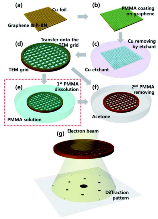 Two-step method for soft dissolving PMMA to prepare the TEM samples. (a) Graphene and h-BN grown on the Cu foil; (b) PMMA coating for supporting the layer of graphene and h-BN; (c) etching the Cu foil by Cu etchant; (d) transferring PMMA coated graphene onto the TEM grid and drying for 1 day; (e) first step for soft dissolving PMMA by PMMA solution; (f) cleaning and removal of PMMA residue by acetone as a second step; (g) analyzing the fabricated samples by TEM [48]. Copyright 2016, RSC adv.