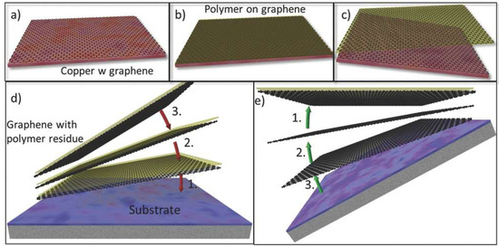 Graphene stack production: (a) Graphene is grown on copper by CVD and (b) coated by polymer for transfer. (c) After dissolving the copper, the graphene is transferred onto another piece of graphene on copper, and the process is repeated until the desired number of layers has been transferred. (d) The conventional transfer with polymer residue between layers works by building the stack layer-by-layer on the final substrate. (e) The modified transfer without polymer residue between layers works by building the stack under one polymer layer and by transferring to the final substrate at the end [74]. Copyright 2015, Adv. Mater. Interfaces.