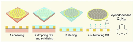 Cyclododecane (CD), a cyclic hydrocarbon, emerges as another exceptional support material [83]. This nontoxic compound exists as a solid at room temperature and exhibits a vapor pressure of 1.33 kPa at 100 °C, allowing complete sublimation under ambient atmospheric conditions without residue. Through melt-recrystallization, CD forms a crack-suppressing rigid protective layer [84]. Wang et al. leveraged this property by coating molten CD onto 2D materials (e.g., graphene or MoS2) after adhesion to target substrates via isopropyl alcohol (IPA) evaporation-induced surface tension. The CD support layer enabled damage-free suspended membrane fabrication through subsequent sublimation, showcasing its dual functionality as both transfer medium and structural reinforcement (Figure 6) [51].