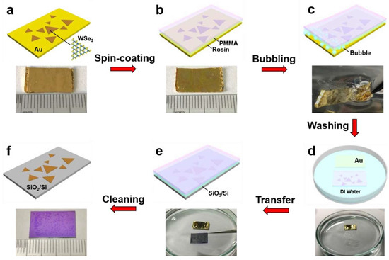 Transfer process of CVD-grown WSe2 on Au foil using the electrochemical bubbling method and the PMMA/rosin double support layer. (a) CVD-grown WSe2 on a Au substrate. (b) A PMMA/rosin/WSe2/Au stack obtained by spin-coating a thin layer of rosin and then PMMA. (c) Separation of the PMMA/rosin/WSe2 stack from the Au foil driven by H2 bubbles. (d) Separated PMMA/rosin/WSe2 stack and Au substrate in water. (e) The PMMA/rosin/WSe2/target substrate stack obtained by collecting the floating PMMA/rosin/WSe2 with the target substrate. (f) WSe2 on the target substrate, which was obtained after removing PMMA/rosin by repeatedly washing in warm acetone and rinsing with isopropanol, and then drying under a high-purity N2 flow [91]. Copyright 2019, ACS Nano.