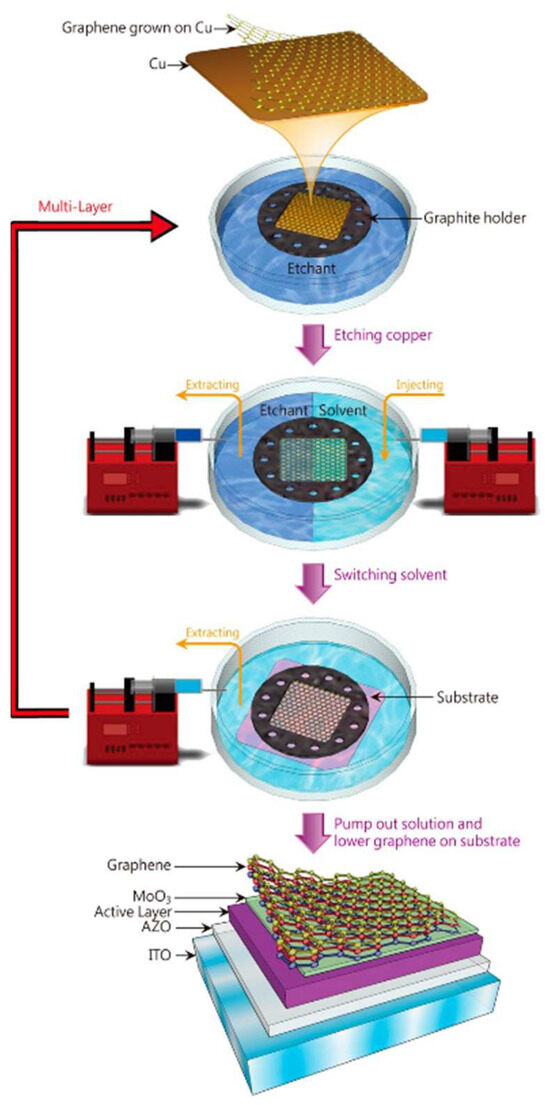 Schematic illustration of the polymer-free transfer process. The process initiates by positioning the graphene scaffold at the liquid–gas interface of an etchant comprising IPA and 0.1 M ammonium persulfate (APS), leveraging spatial confinement to stabilize monolayer graphene floating at the interface post-copper etching. Subsequently, a dual-syringe system enables synchronized pumping-out of the etchant (0.3 mL/min) and infusion of water/IPA mixture, achieving surface tension-regulated gradient solvent replacement. Upon complete etchant substitution, the target substrate is aligned beneath the floating graphene, followed by uniform solution withdrawal to realize damage-free film-substrate lamination. Finally, thermal annealing is conducted at 60 °C for 10 min under nitrogen atmosphere [59]. Copyright 2014, ACS Nano.