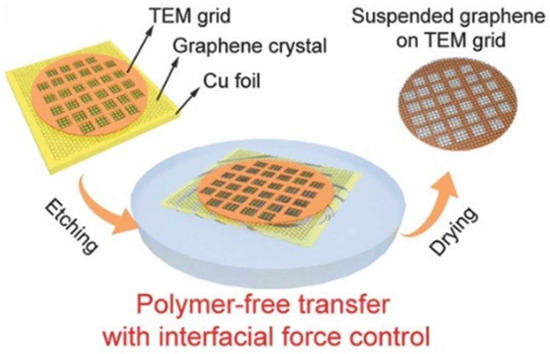 Zhang et al. achieved polymer-free, clean transfer of sub-centimeter-scale graphene single crystals onto TEM grids for fabricating large-area, high-quality suspended graphene membranes (Figure 9) [96]. By precisely controlling interfacial forces during the transfer process, the structural integrity of large-area graphene films reached up to 95%. Leveraging this advancement, the team further developed graphene liquid cells through π–π stacking of two pristine single-crystal graphene membranes on TEM grids. This approach eliminates polymer-induced contamination while maintaining atomic-level flatness across centimeter-scale suspended regions, enabling high-resolution TEM characterization of dynamic processes at liquid–solid interfaces.