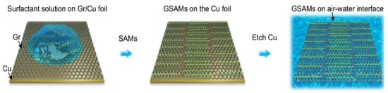 Schematic illustration showing the on-site assembly of GSAMs superstructure. After the evaporation of surfactant solution (left), the self-assembled monolayers of surfactant molecules are spontaneously formed on the graphene/copper surface (middle). The free-standing GSAMs superstructure on the water surface can be achieved after the copper foil is etched away (right) [52]. Copyright 2024, Nat. Commun.