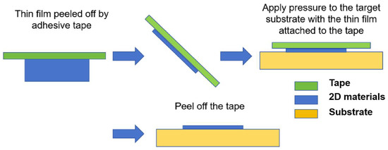 Mechanical exfoliation, as a classical method for preparing 2D materials, comprises three major steps: (1) repeatedly cleaving bulk crystals using adhesive tape to obtain few-layer 2D materials, (2) pressing the tape-attached flakes onto target substrates (e.g., SiO2/Si) for intimate contact, and (3) gently peeling off the tape after thermal treatment (typically 150–200 °C) to weaken interfacial adhesion during cooling (Figure 11) [18,38,97,98,99]. The main advantage of this approach is its complete elimination of chemical etching processes—unlike conventional metal-based substrate etching (e.g., Ni, Cu), which requires highly corrosive agents such as iron nitrate, ferric chloride, or ammonium persulfate. These chemical treatments not only incur substantial processing costs but also induce doping through residual metal ions from the etchant. By eliminating such chemical interventions, mechanical exfoliation preserves the intrinsic electronic properties of 2D materials while achieving atomically clean interfaces, making it indispensable for fundamental studies requiring pristine material characteristics. The technique’s simplicity and reproducibility have established it as a foundational methodology in nanomaterial research, particularly for prototyping quantum devices and investigating thickness-dependent physical phenomena.