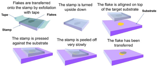 - Castellanos-Gomez, A.; Buscema, M.; Molenaar, R.; Singh, V.; Janssen, L.; van der Zant, H.S.J.; Steele, G.A. Deterministic Transfer of Two-Dimensional Materials by All-Dry Viscoelastic Stamping. 2D Mater. 2014, 1, 011002. [Google Scholar] [CrossRef]