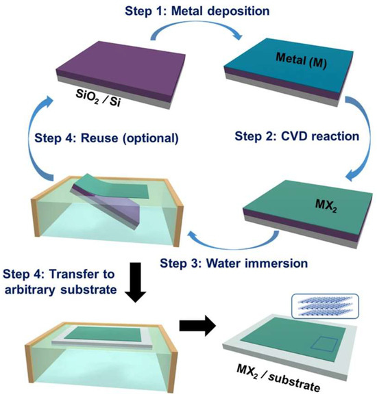 Schematic to illustrate the water-assisted green integration of CVD-grown 2D TMD layers on arbitrary substrates: (1) Deposition of transition metals on the surface of growth substrates (i.e., SiO2/Si) followed by their conversion to 2D TMD layers via CVD. (2) Immersion of the 2D TMDs-grown SiO2/Si substrates inside water followed by spontaneous 2D layer separation. (3) Transfer and integration of the delaminated 2D TMD layers onto secondary substrates inside water. (4) Recycling of the original growth substrates for additional 2D TMDs growth (optional) [126]. Copyright 2019, Sci Rep.