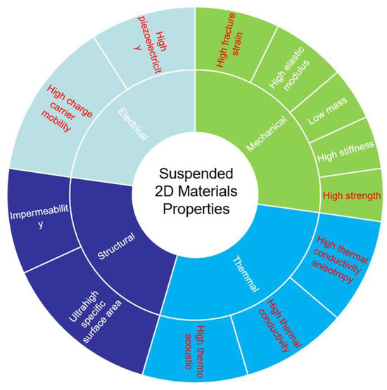 Suspended 2D materials properties. Red represents the unique properties of suspended 2D materials.