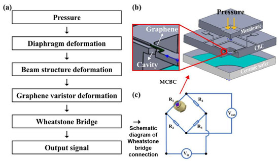 (a) Working principle of pressure sensor. (b) MCBC structure quarter model. (c) Schematic diagram of Wheatstone bridge connection [160]. When external pressure acts on the sensing membrane, the membrane undergoes downward deformation, mechanically driving axial displacement and bending deformation in the central bearing component (CBC). This deformation propagates to the embedded graphene piezoresistive sensor at the beam root, where lattice stretching generates tensile strain, resulting in increased electrical resistance. The resistance change disrupts the equilibrium of the Wheatstone bridge, producing a differential voltage signal with linear pressure dependence, thereby enabling high-precision quantitative measurements. Copyright 2025, ACS Appl. Electron. Mater.