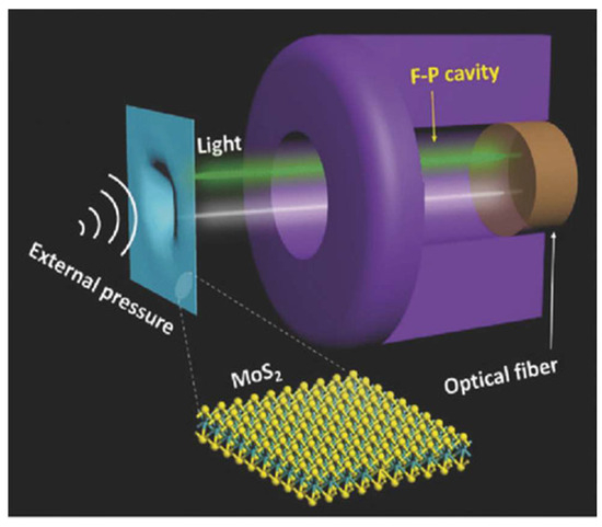Sensor schematic diagram [163]. Laser light is coupled via optical fiber into a Fabry–Pérot (F-P) interferometric cavity, where a photodetector continuously monitors dynamic cavity length variations through acquisition of interference spectra. Phase demodulation algorithms resolve micro-displacements in cavity length, establishing a pressure-to-cavity length correlation that enables high-sensitivity detection of external pressure. Copyright 2017, Adv. Mater.