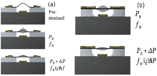 Piezoresistive pressure sensors (commonly referred to as strain-based pressure sensors) operate by detecting resistance variations in 2D material membranes induced by strain under pressure differentials. When a suspended 2D material membrane deflects due to applied pressure, the resulting strain alters the material’s electrical resistance, enabling pressure quantification through precise resistance monitoring. It should be noted that the gas or moisture in contact with the suspended 2D material film usually affects its resistance, thereby interfering with the piezoresistive signal during pressure measurement [151,152,153,154,155,156,157,158].
