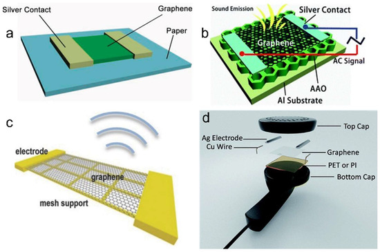 - Suk, J.W.; Kirk, K.; Hao, Y.; Hall, N.A.; Ruoff, R.S. Thermoacoustic Sound Generation from Monolayer Graphene for Transparent and Flexible Sound Sources. Adv. Mater. 2012, 24, 6342–6347. [Google Scholar] [CrossRef]