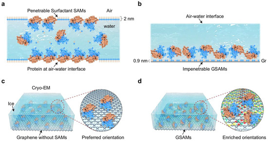 Furthermore, Zheng et al. developed a robust methodology for high-resolution cryo-electron microscopy (cryo-EM) analysis by engineering a graphene–surfactant hybrid superstructure termed GSAM [52]. This method dissolves surfactant self-assembled monolayers (SAM) in IPA, and based on the aforementioned direct transfer method, combines SAM with graphene film to form a new suspended structure, creating a molecularly ordered interface while immobilizing biomolecule samples and minimizing background noise (Figure 10). This dual-functional interface addresses longstanding challenges in cryo-EM sample preparation by combining graphene’s mechanical stability with SAM-enabled biochemical precision, establishing a universal platform for next-generation structural biology investigations.