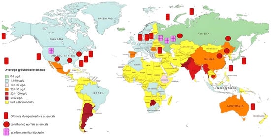 Global distribution of arsenic contamination in groundwater and locations of warfare-related arsenicals [23].