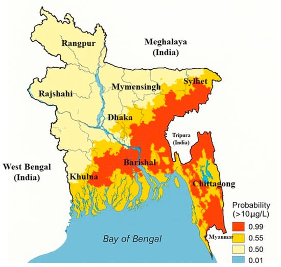 Geospatial distribution of arsenic contamination in tubewell water across Bangladesh (based on figurative data from [7,8,24]).