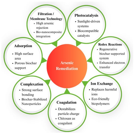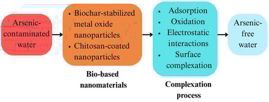 Bio-based nanomaterials for arsenic remediation are increasingly interesting because of their efficiency, sustainability, and ability to function through complexation-based methods, as shown in Figure 8. These mechanisms use the distinctive properties of nanomaterials to efficiently remove arsenic through the methods of adsorption, oxidation, electrostatic interactions, and surface complexation. The synthesis of biochar-stabilized metal oxide nanoparticles, such as biochar@Fe and biochar@Cu, is a major development in this field. By preventing nanoparticle aggregation, often considered with bare nanoparticles, these composites help preserve the high surface area necessary for effective arsenic adsorption [96]. With over 95% efficiency in arsenic removal, they provide a strong solution for practical use in water treatment. However, given that the stability of arsenic complexes and their removal from groundwater can be challenging, there is a risk of incomplete removal or secondary contamination in this process [102]. Biodegradable biopolymer chitosan is also used to stabilize magnet-sensitive nanoparticles. Their magnetic characteristics, which enable simple recovery post-adsorption, are a major benefit for scalable uses, causing these chitosan-coated nanomaterials to show improved reusability [57]. This not only increases operational efficiency but also reduces secondary waste production, an often-neglected limitation of conventional treatment methods.