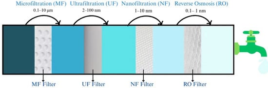 Membrane-based treatment, as shown in Figure 5, using nanomaterials has emerged as a highly promising strategy for arsenic removal from water, primarily due to the enhanced filtration efficiency and selectivity offered by nanomaterials [73,74]. The mechanism is relatively simple: arsenic-contaminated water is purified as it passes through the membrane, where arsenic ions are removed through filtration. The four basic filtration processes in filtration/membrane technology include microfiltration, ultrafiltration, nanofiltration, and reverse osmosis with different pore sizes [75].