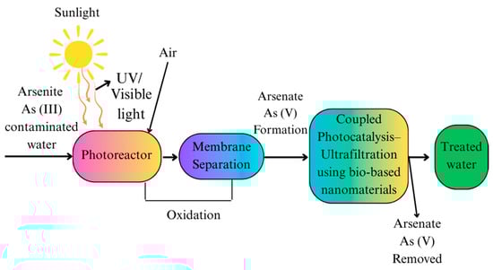 Arsenic remediation is being effectively and sustainably carried out through photocatalysis using bio-based nanomaterials, as shown in Figure 7. Photocatalysis rapidly oxidizes As (III) to As (V) by utilizing TiO2 or other metal oxides under UV or visible light. This process follows zero-order kinetics and can achieve up to 97% oxidation within minutes [88,89]. This method improves arsenic removal through the processes of both oxidation and adsorption, using the intrinsic properties of nanomaterials, including high surface area, catalytic activity, and environmental compatibility. Photocatalytic methods can be limited by low efficiency under natural sunlight, the need for specific catalysts, and challenges in scaling up for large-scale applications [90].