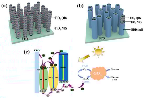 - Ma, J.; Zhang, M.; Su, W.; Wu, B.; Yang, Z.; Wang, X.; Qiang, B.; Pei, H.; Tu, J.; Chen, D.; et al. Photoelectrochemical enzyme biosensor based on TiO2 nanorod/TiO2 quantum dot/polydopamine/glucose oxidase composites with strong visible-light response. Langmuir 2022, 38, 751–761. [Google Scholar] [CrossRef]