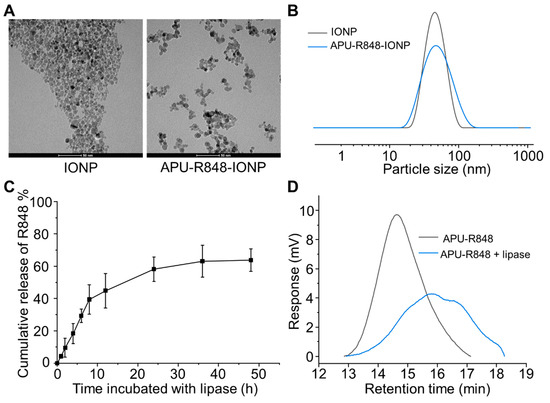 | APU-R848-IONP (IONP coated with APU-R848) | 5.6 ± 2.3 mV | 58.5 ± 6.1 nm | 13.2 ± 3.0 nm |