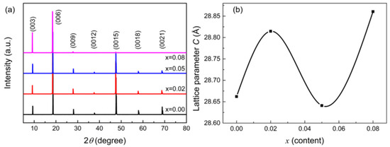 Figure 1a shows the XRD patterns for the LixBi2−xSe3 crystals. All the diffraction peaks are attributed to the (0 0 l) orientation of Bi2Se3 without an obvious impurity phase, which indicates that the samples have a pure c-axis orientation. The lattice constants of the c-axis were calculated, as shown in Figure 1b. With Li contents ranging from 0 to 0.08, the parameter c increases from 28.66 Å, 28.82 Å, 28.63 Å and 28.86 Å. The results indicate that Li atoms are mixed into the Bi2Se3 crystal.