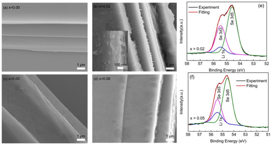 FESEM images of LixBi2−xSe3: (a) x = 0.00; (b) x = 0.02; (c) x = 0.05; (d) x = 0.08; (e) and (f) the XPS spectra of the Li0.02Bi1.98Se3 and Li0.05Bi1.95Se3.