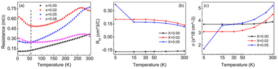 The relaxation process for τ3 is attributed to electron–phonon coupling, as shown in Figure 6c,d. The relaxation time (τ3) becomes shorter from 5 K to 280 K. In particular, τ3−1 is very slow at low temperatures. The variation in τ3 and τ3−1 is also consistent with the R-T and carrier concentration. The temperature dependence of τ3 and τ3-1 indicates that the electron–phonon coupling is weak at low temperature (T ≤ 55 K).