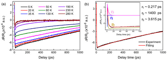 (a) Femtosecond (fs) transient optical spectroscopy (ΔR/R(t) signals) measured for Li0.02Bi1.98Se3 at various temperatures ranging from 5 K to 280 K. (b) Representative differential reflectivity at 5 K; the red line is a fit to Equation (1). Inset: demonstration of three independent exponential relaxation processes with time constants of τ1 (blue line), τ2 (light brown line), and τ3 (pink line).