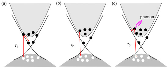 where Ai and τi are the amplitude and relaxation time of the decay of hot carriers via different relaxation mechanisms. C is a constant. The three times constants of the three relaxation processes in LixBi2−xSe3 crystals can be fitted by Equation (1), where τ1 is the time constant of electron–electron interaction, τ2 is the time constant of the carrier recombination process, and τ3 is the time constant of electron–phonon coupling.
