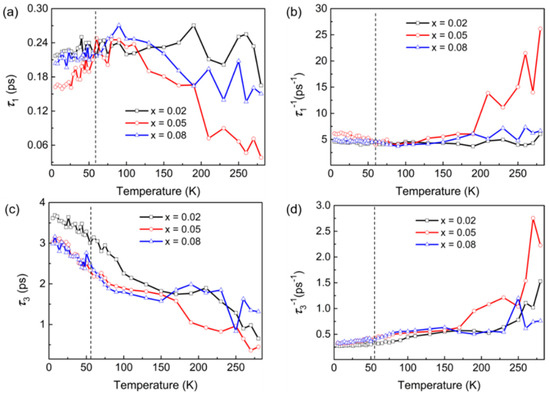 (a,b) The inverse of the decay time constants (τ1 and τ1−1) at different temperatures for LixBi2−xSe3. (c,d) The inverse of the decay time constants (τ3 and τ3−1) at different temperatures for LixBi2−xSe3.