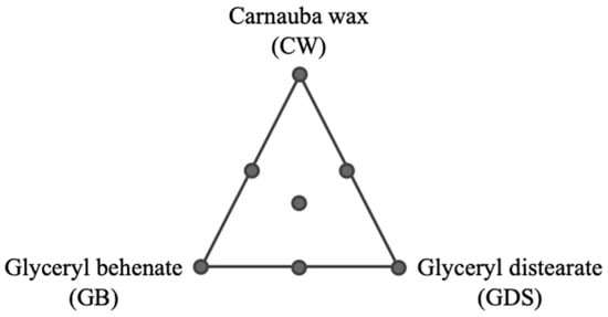 Representation of the seven experimental conditions established for the mixture design with three mixture variables: proportion of carnauba wax, proportion of glyceryl behenate, and proportion of glyceryl distearate in the lipidic fraction.