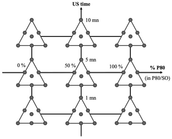 Representation of the 63 experimental conditions established for the design of experiments combining the two quantitative variables (% of polysorbate 80 in P80/SO couple and US time) and the mixture design with three mixture variables (Figure 1).