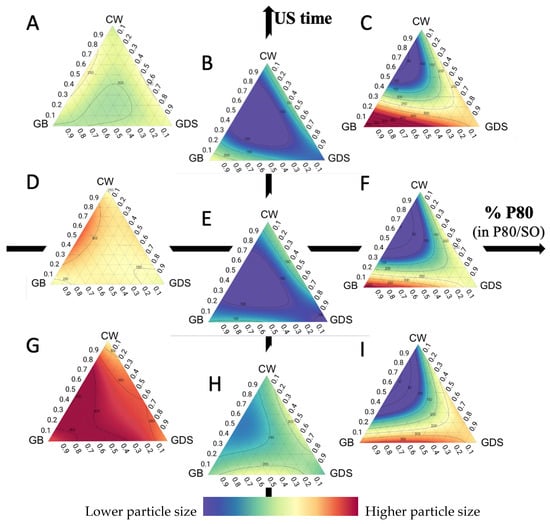 Specifically, when the formulation consists of 100% SO (so 0% of P80), ultrasound duration has a modest effect, requiring the use of a binary mixture comprising GB and CW (Figure 5A,D,G).