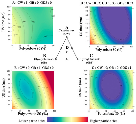 Surface plot representations of the particle size as a function of the percentage of polysorbate 80 (in P80/SO) and ultrasound time in four places of the ternary diagram. (A) with carnauba wax (CW) as the sole lipid (proportion = 1); (B) with glyceryl behenate (GB) as the sole lipid (proportion = 1); (C) with glyceryl distearate (GDS) as the sole lipid (proportion = 1); (D) with an equal mixture of CW, GB, and GDS (proportion = 0.33 each).